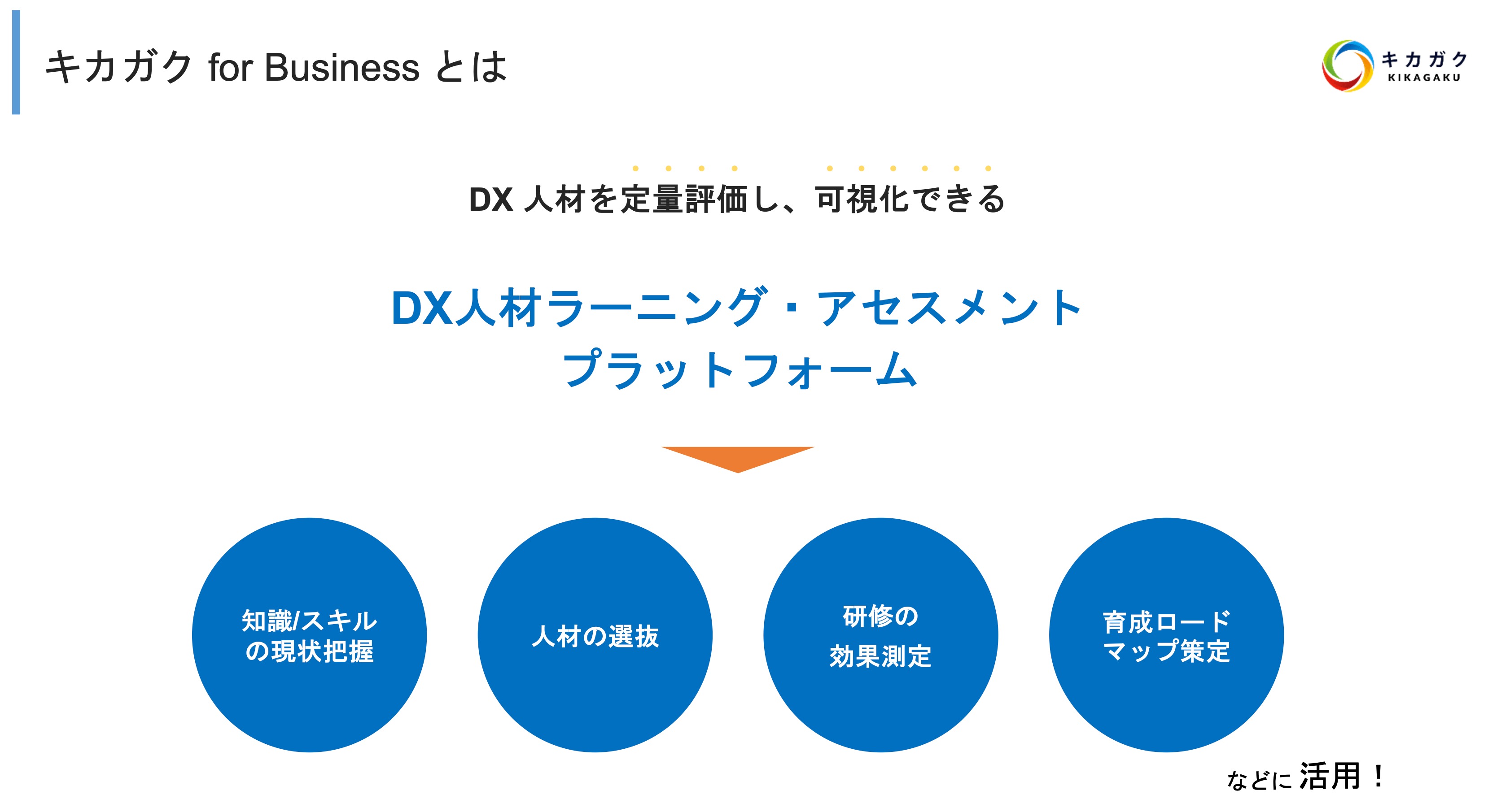 キカガク for Business はそういった課題を解決するために、 現状把握、選抜、育成、評価を一気通貫でできるサービスとなりました。
