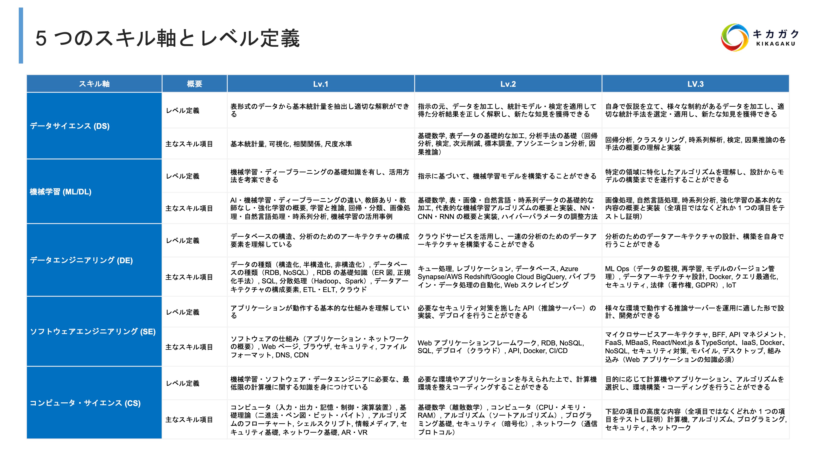 下図: データサイエンティストのスキル可視化の 5 つのスキル軸と 3 段階のレベル