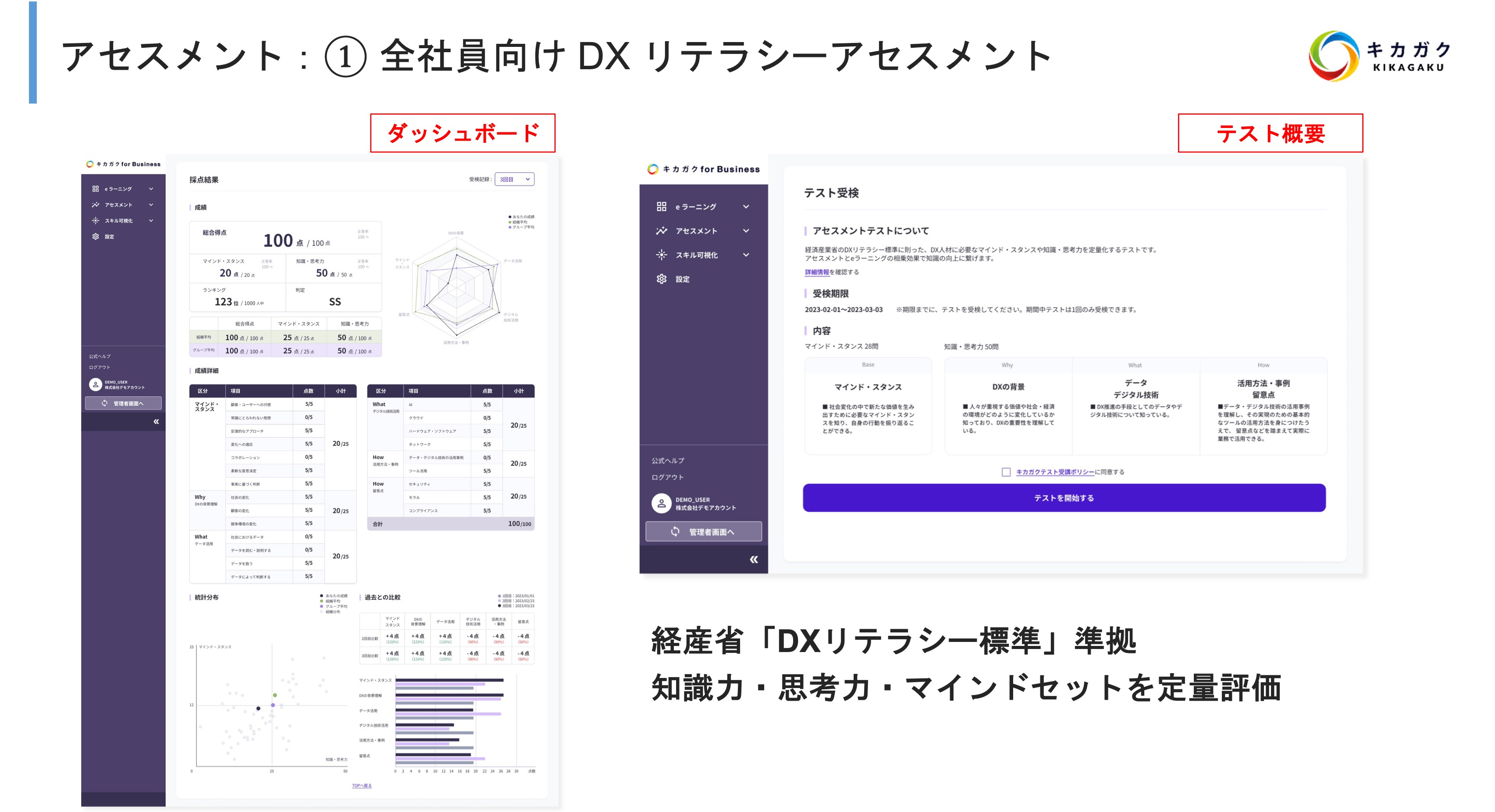 下図:DX リテラシーアセスメントのダッシュボードとテストページのイメージ