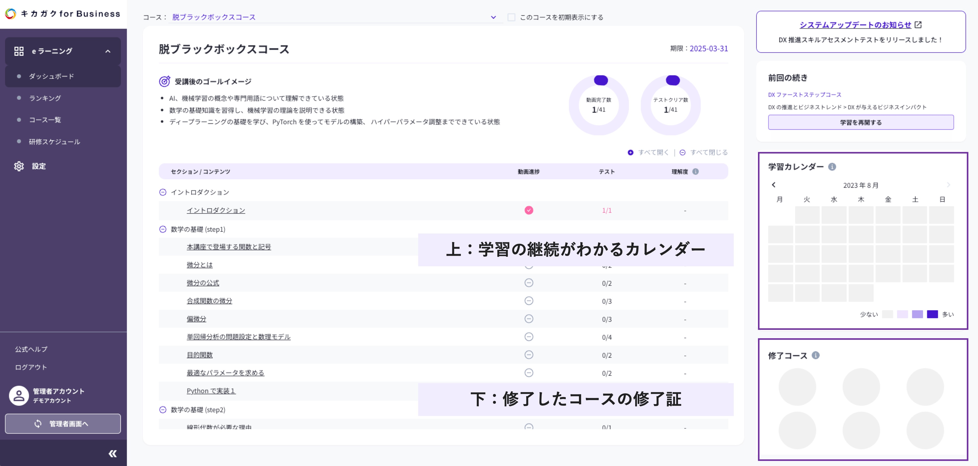 また、どれくらい継続して学習が続いたわかる「学習カレンダー」や修了したコースがわかる「コース修了証」がダッシュボードに掲載されます。