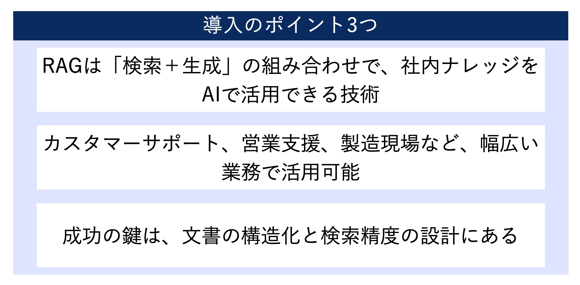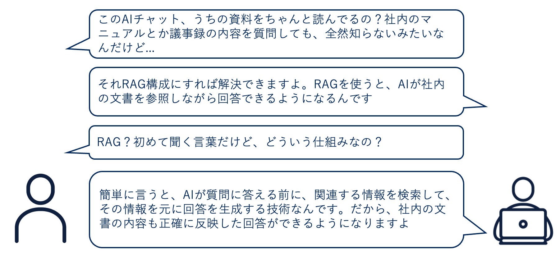 社員B:「簡単に言うと、AIが質問に答える前に、関連する情報を検索して、その情報を元に回答を生成する技術なんです。だから、社内の文書の内容も正確に反映した回答ができるようになりますよ」