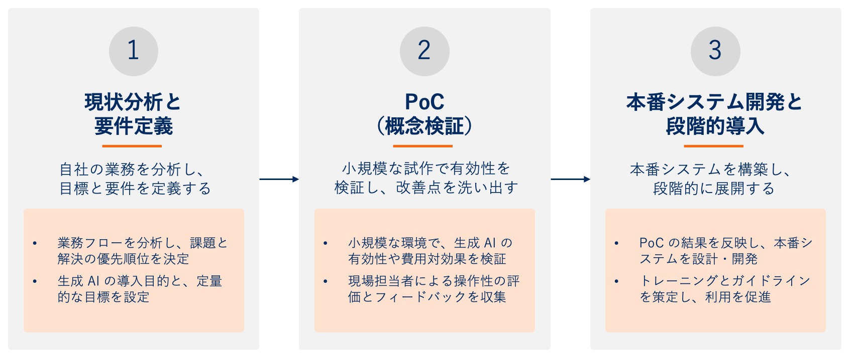 生成 AI の導入を成功に導くためには、計画的なアプローチが求められます。具体的な導入ステップを解説します。