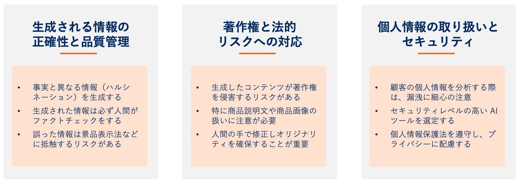 生成 AI は多くのメリットをもたらす一方で、その活用には慎重な検討が必要です。特に法律面のリスクも踏まえ、3つの重要なポイントを解説します。