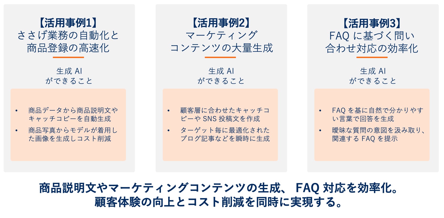 生成 AI は、 EC サイトの運営における様々な業務プロセスを効率化し、売上向上に貢献します。ここでは、代表的な3つの活用事例をご紹介します。