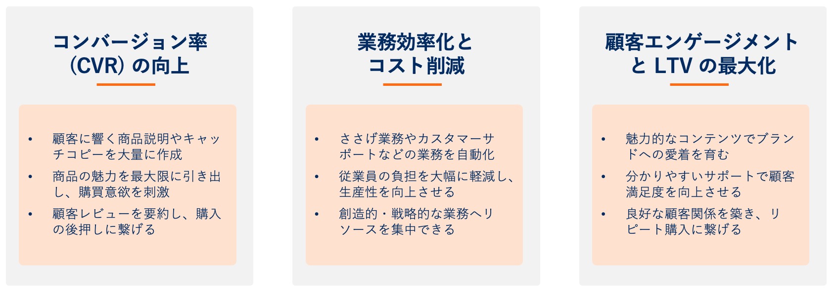 生成 AI を導入することで、 EC 事業者はどのようなメリットを得られるのでしょうか。3つの主要なメリットを解説します。