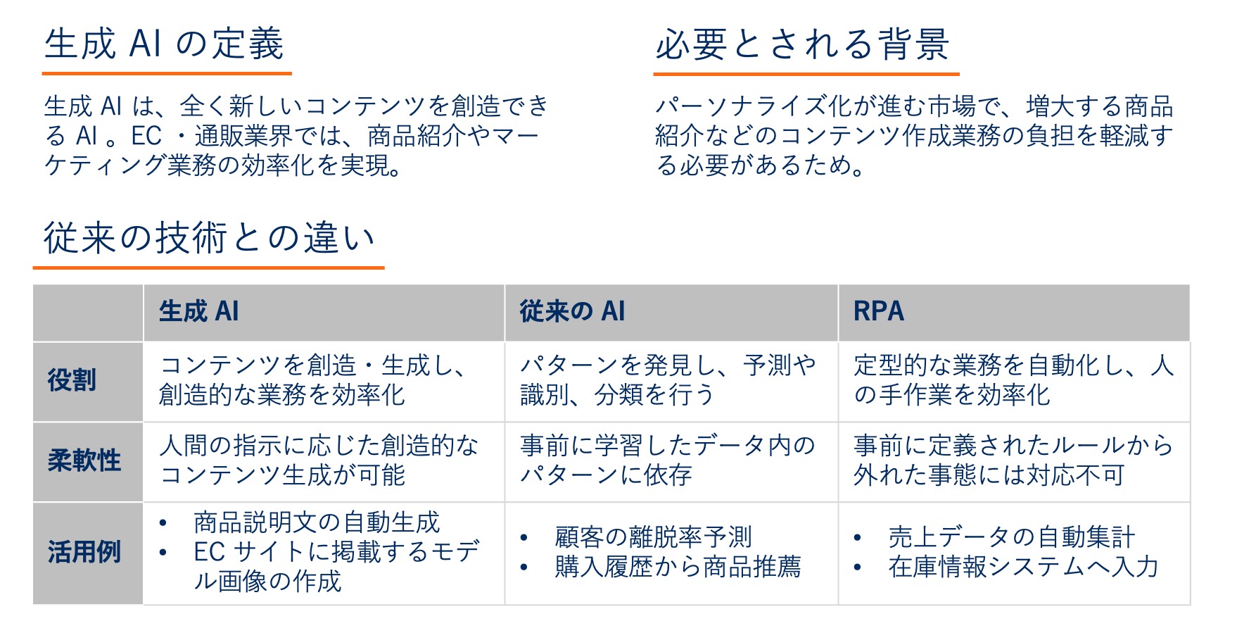 項目 | 生成 AI | 従来の AI | RPA |