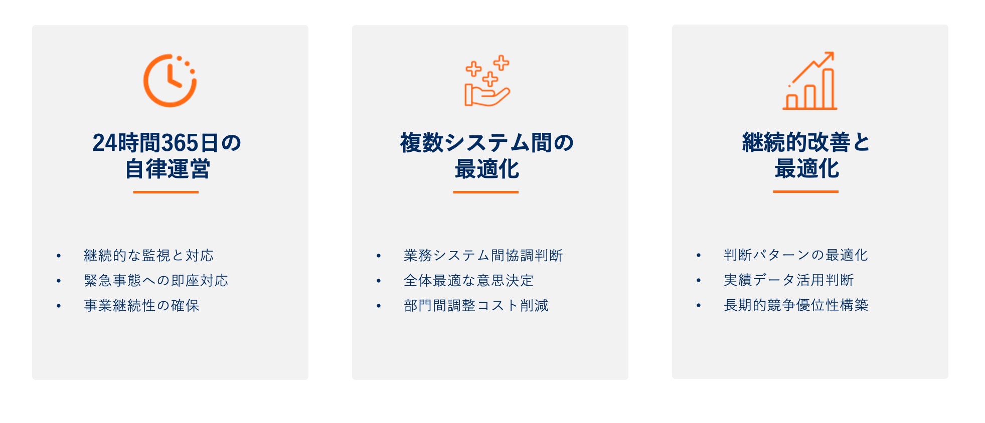例えば、需要予測の変動に応じて、生産計画の調整、原材料の発注、配送ルートの変更を同時に実行することで、個別最適ではなく全体最適を追求できます。これにより、部門間の調整コストを削減しながら、企業全体の効率性を大幅に向上させることができます。