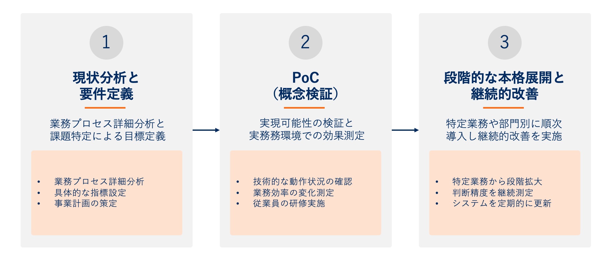 PoC の成果を基に、段階的に適用範囲を拡大していきます。従業員の研修を実施し、新しいシステムに対する理解や受け入れ体制を構築しつつ、一度に全社展開するのではなく、特定の業務や部門別・拠点別に順次導入することで、各段階での学習内容を次の展開に活かすことができます。