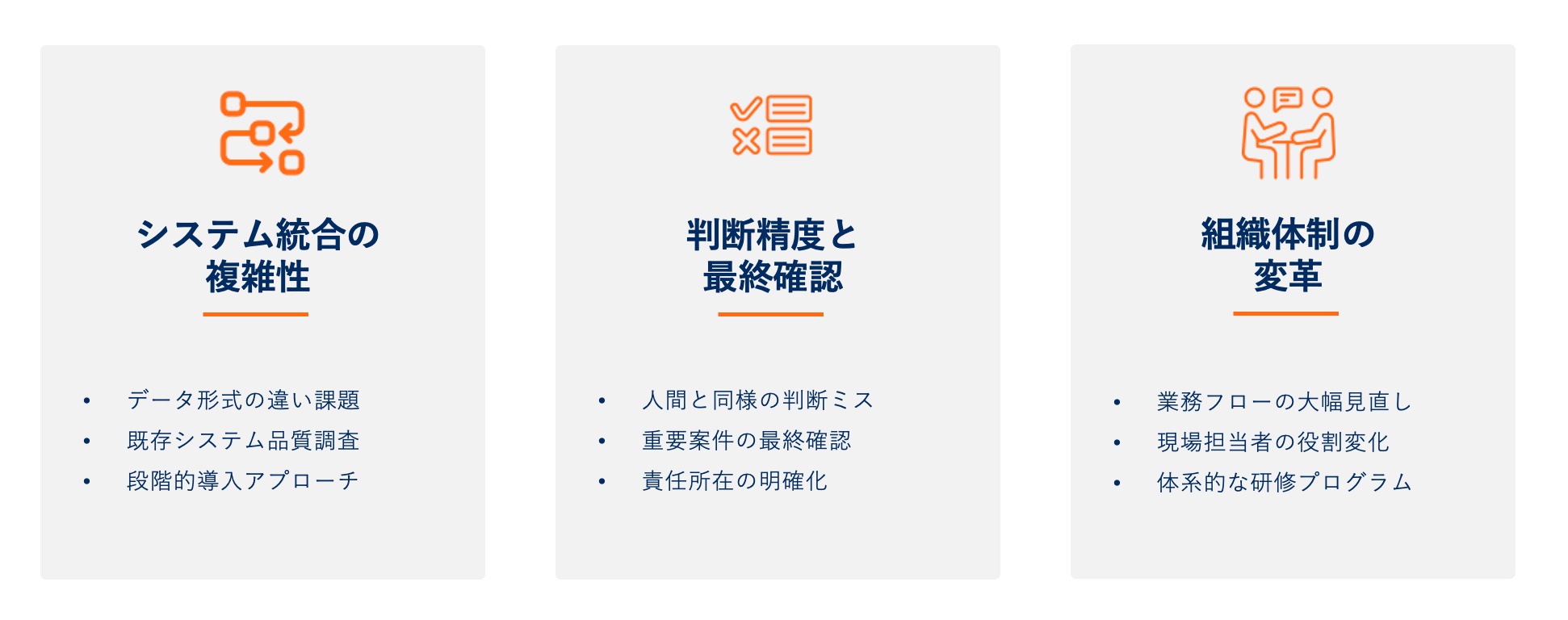 導入には、システム統合の複雑性、 AI エージェントの判断ミスへの対策、組織変革といった課題もありますが、 PoC から始める段階的なアプローチと人間による適切な最終確認体制により、これらの課題は克服可能です。24時間365日の自律運営、複数システム間の最適化、継続的な改善と最適化という3つの主要メリットは、企業の競争力向上に大きく貢献します。