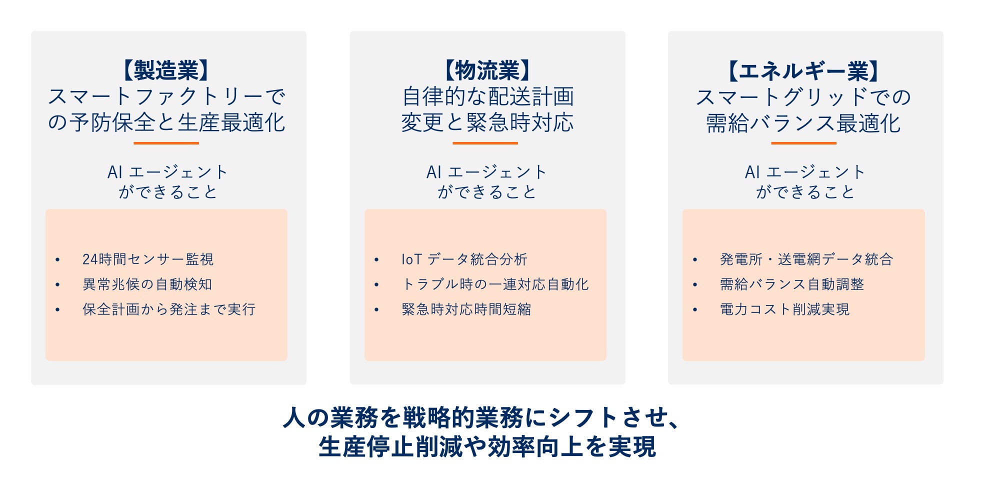 AI エージェント× IoT は、従来の個別システムでは実現できなかった自律的で統合的な業務運営を可能にする革新的なソリューションです。製造業での予防保全、物流業での配送最適化、エネルギー業での需給バランス調整など、様々な業界で人の業務範囲を戦略的業務にシフトさせながら具体的な成果を実現しています。