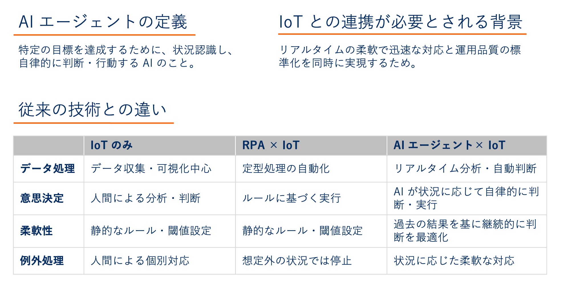 このように、 IoT のみが「監視・通知ツール」、 RPA × IoT が「定型業務の自動化ツール」であるのに対し、 AI エージェント× IoT は「自律的な業務執行パートナー」として機能します。