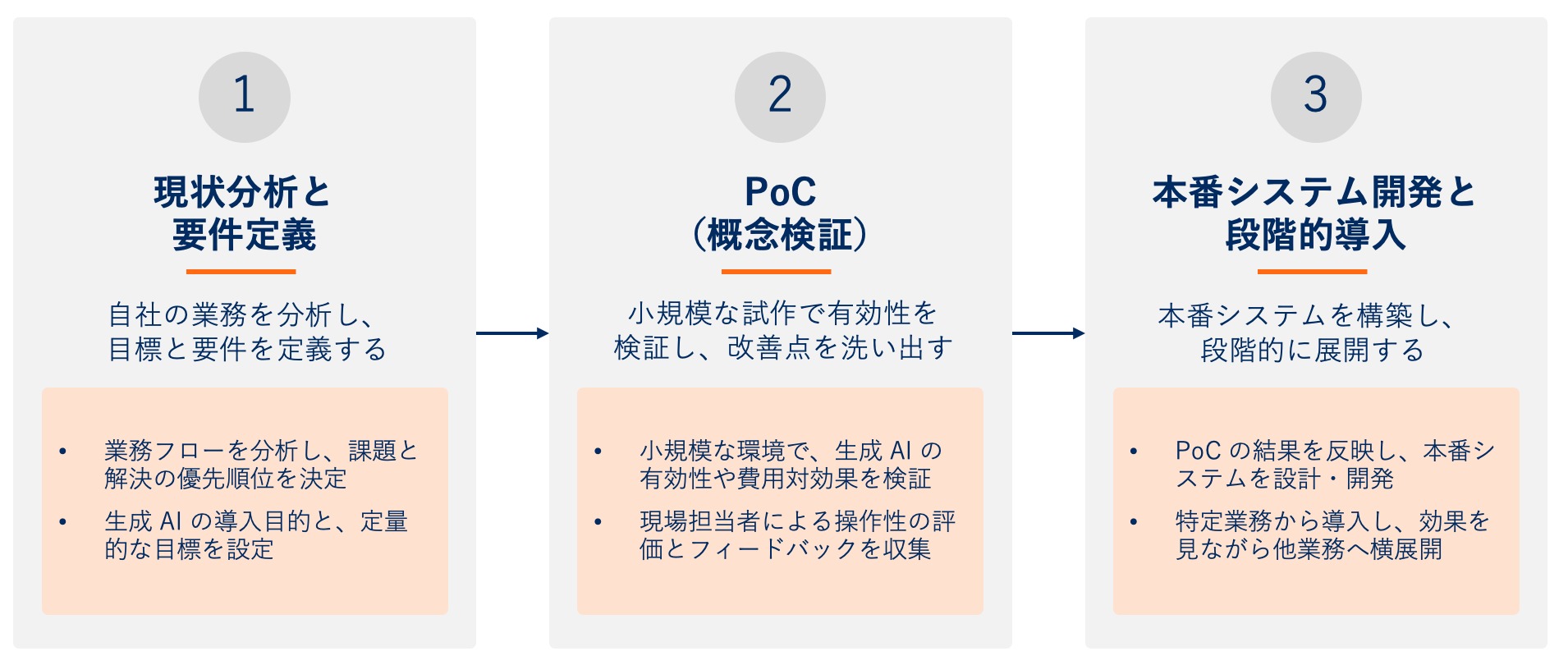 財務・経理部門への生成 AI 導入を成功させるためには、計画的なアプローチが不可欠です。ここでは、失敗リスクを最小化し、効果を最大化するための標準的な3つのステップをご紹介します。