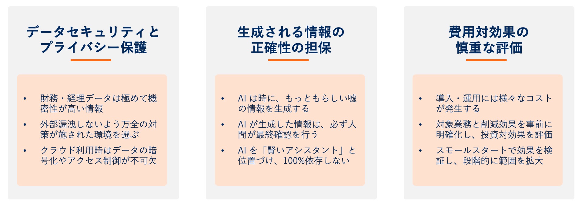 生成 AI は、時に「ハルシネーション」と呼ばれる、もっともらしい嘘の情報を生成することがあります。財務・経理業務において、誤った数値や情報に基づく処理は許されません。そのため、AI が生成した仕訳データやレポートは、必ず人間の専門家が最終確認し、その正確性を担保するプロセスを業務フローに組み込むことが絶対条件です。AI を「賢いアシスタント」と位置づけ、100%依存しない運用が重要です。