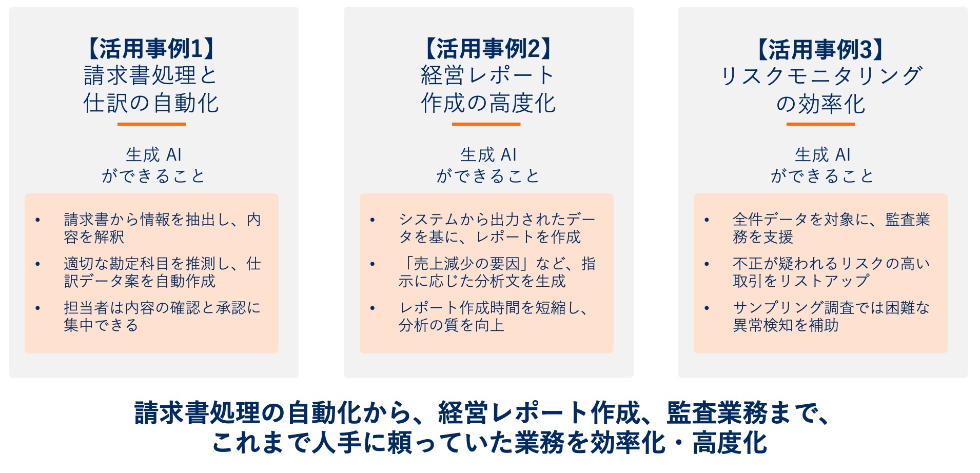 生成 AI は、すでに財務・経理部門の様々な業務でその効果を発揮し始めています。ここでは代表的な3つの活用事例をご紹介します。