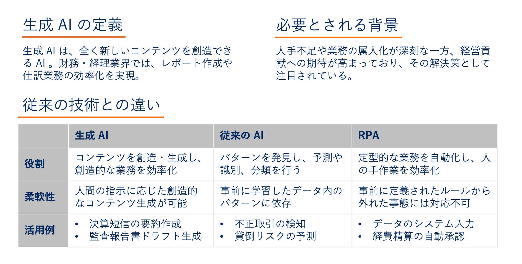生成 AI とは、テキスト、画像、音声、プログラムコードといった、全く新しいオリジナルのコンテンツをゼロから創り出すことができる AI のことです。 財務・経理の領域においては、単にデータを処理するだけでなく、例えば過去の財務データから来期の業績予測レポートを自動生成したり、問い合わせに対して人間のように自然な文章で回答したりと、より高度で知的な業務をサポートします。これにより、担当者は単純作業から解放され、より戦略的な分析や意思決定に集中できるようになります。