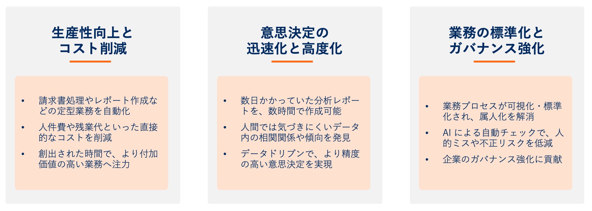 財務・経理部門に生成 AI を導入することは、単なる業務効率化にとどまらない、多くの戦略的なメリットをもたらします。