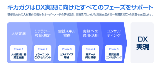 2017年に創業したキカガクは、AIを含む先端技術の教育を軸に企業のDXを支援してきた。「あるべき教育で人の力を解放する」との理念を具現化する教育を実践している。売り上げの9割以上を大手上場企業が占め、特に製造業(自動車、機械、電気機器)での実績が豊富だ。IT(情報技術)業界や建設DXを推進している建設業、鉄道、航空、物流など、様々な業界の企業からDX人材育成の相談を受けているという。人材育成計画の策定支援から始まり、実務活用に向けた実装支援まで、一気通貫してDXの実現を支援している。