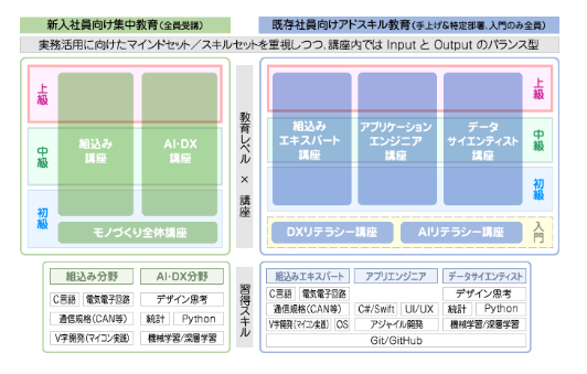 具体的には人工知能(AI)、DX、組み込み技術に焦点を当てて、新入社員と既存社員を対象に研修を実施している。SUBARU技術本部の斎藤誠氏によれば、既存スキルに加えて新たなスキルの習得を促す「アドスキル」により「筋肉質な人財」をつくることを目指しているという。組織全体でAI・DX活用を推進するため、マネジメント層向けの研修も実施。ビジネス課題の解決に向けたAI・デジタル技術の活用を正しく理解・評価し、適切にフォローできる状態をつくる。