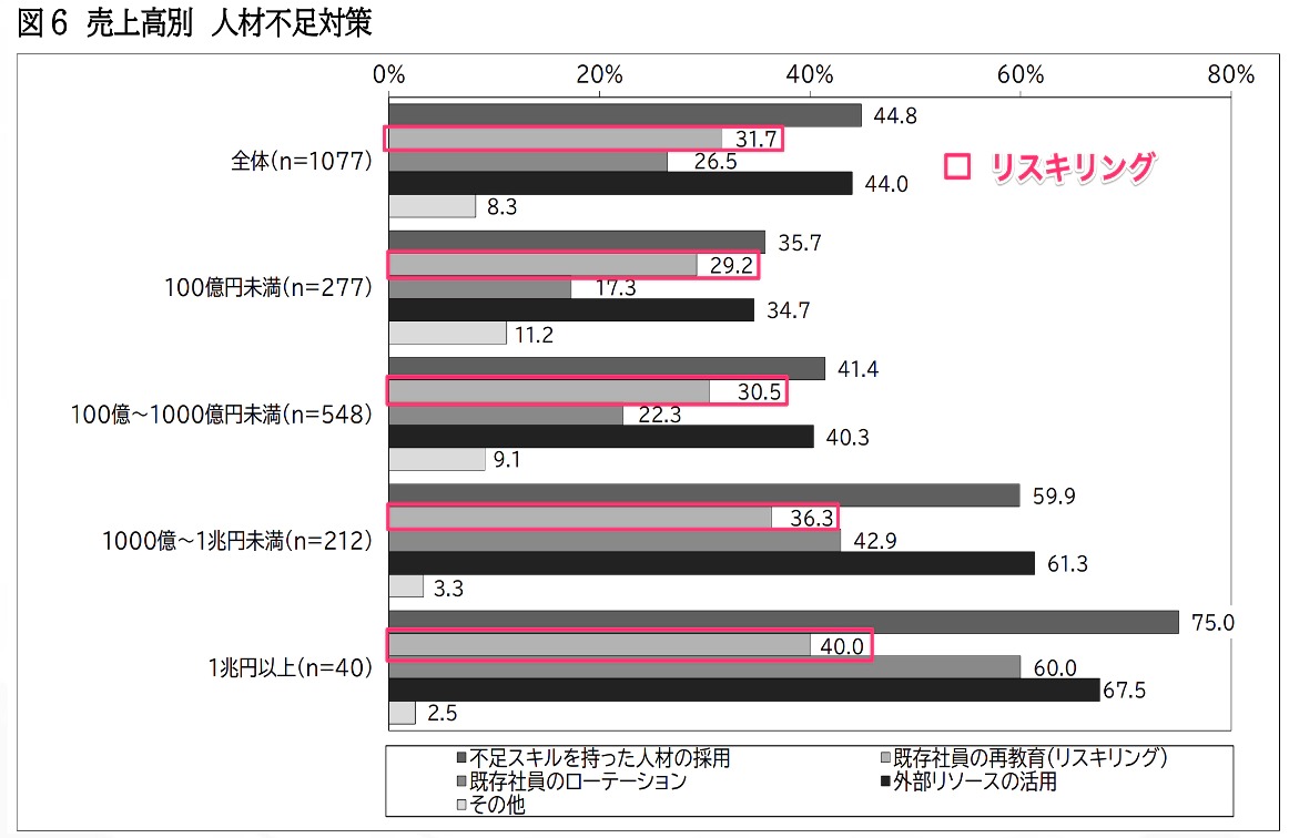 こちらは企業 IT 動向調査に掲載されております、売上高別人材不足対策です。どの規模の売上の企業も、不足スキルを持った人材の採用と外部リソースの活用により人材不足を補っており、リスキリングが進んでいないことがわかると思います。