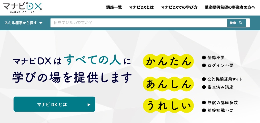 経済産業省によるすべての人にマナビを提供するために立ち上げられた「マナビDX」です。こちらは経済産業省が定義しました「デジタルスキル標準」のレベル別に講座が豊富に用意されています。DX のリテラシーから実践講座まで幅広く用意されているので、自身のレベルに合った講座を選択することができます。