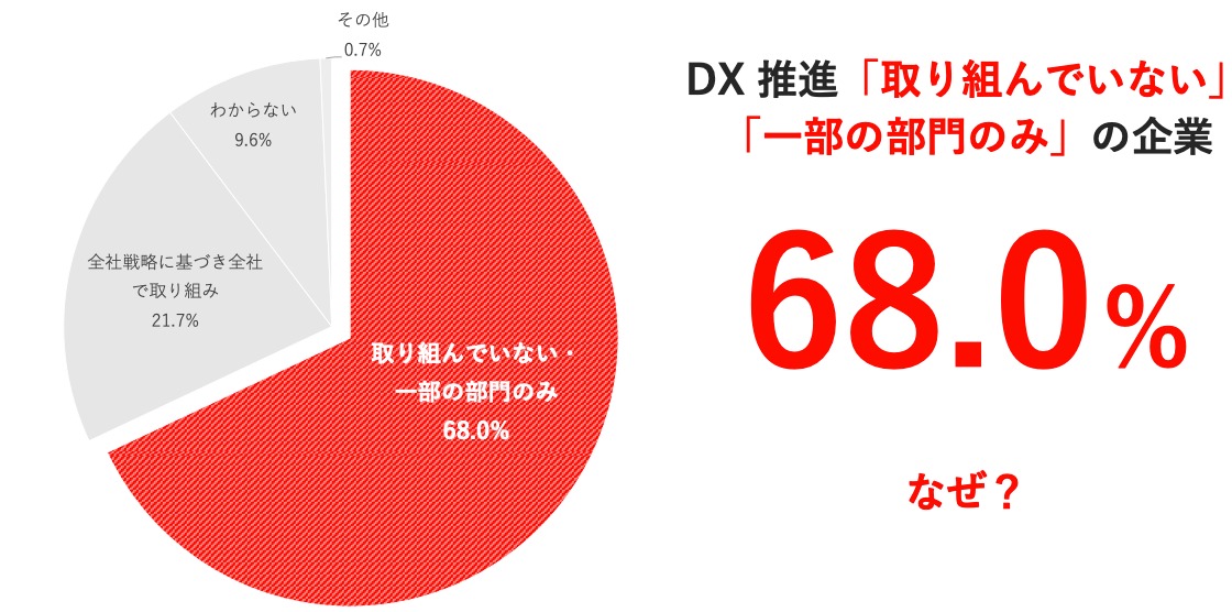 上記を確認してみると、DX 推進に「取り組んでいない」、「一部の部門のみ」の企業が全体の 68.0% と半分以上を占めています。