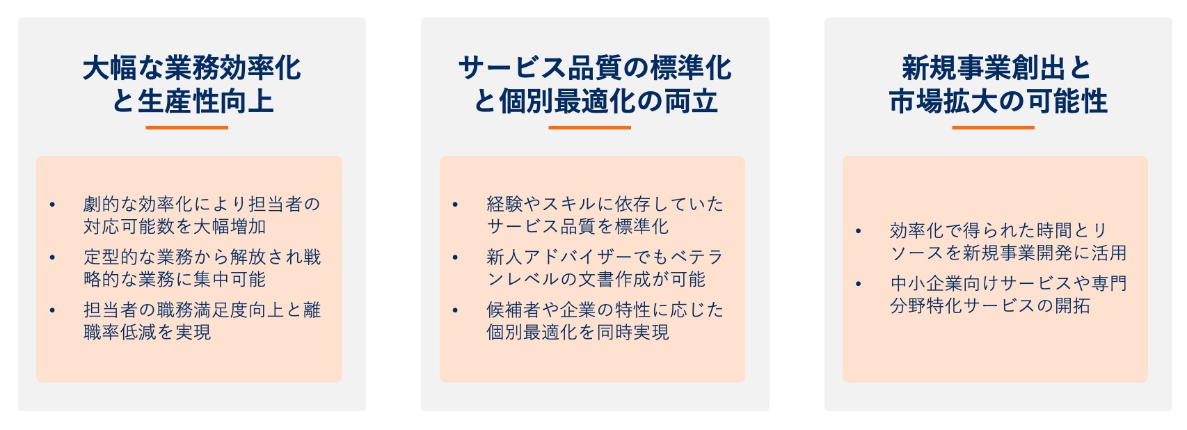 生成 AI の導入により、担当者の経験やスキルに依存していたサービス品質を標準化できます。新人アドバイザーでも、AI が生成した高品質な素案を基に、ベテランレベルの文書を作成することが可能になります。同時に、候補者や企業の特性に応じた個別最適化も実現できるため、標準化と個別化という一見矛盾する要求を両立できます。