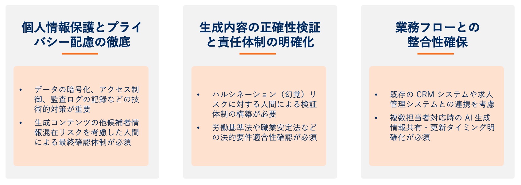 特に求人票作成では、労働基準法や職業安定法などの法的要件を満たす必要があり、AI が生成した内容が法令に適合しているかの確認は必須です。また、企業の実際の職場環境や文化と AI が生成した PR 文に乖離がないかの確認も重要です。誤った情報に基づく採用活動は、企業と候補者双方にとって大きな損失となるため、AI 支援と人間の判断を適切に組み合わせた品質管理体制を整備することが成功の鍵となります。