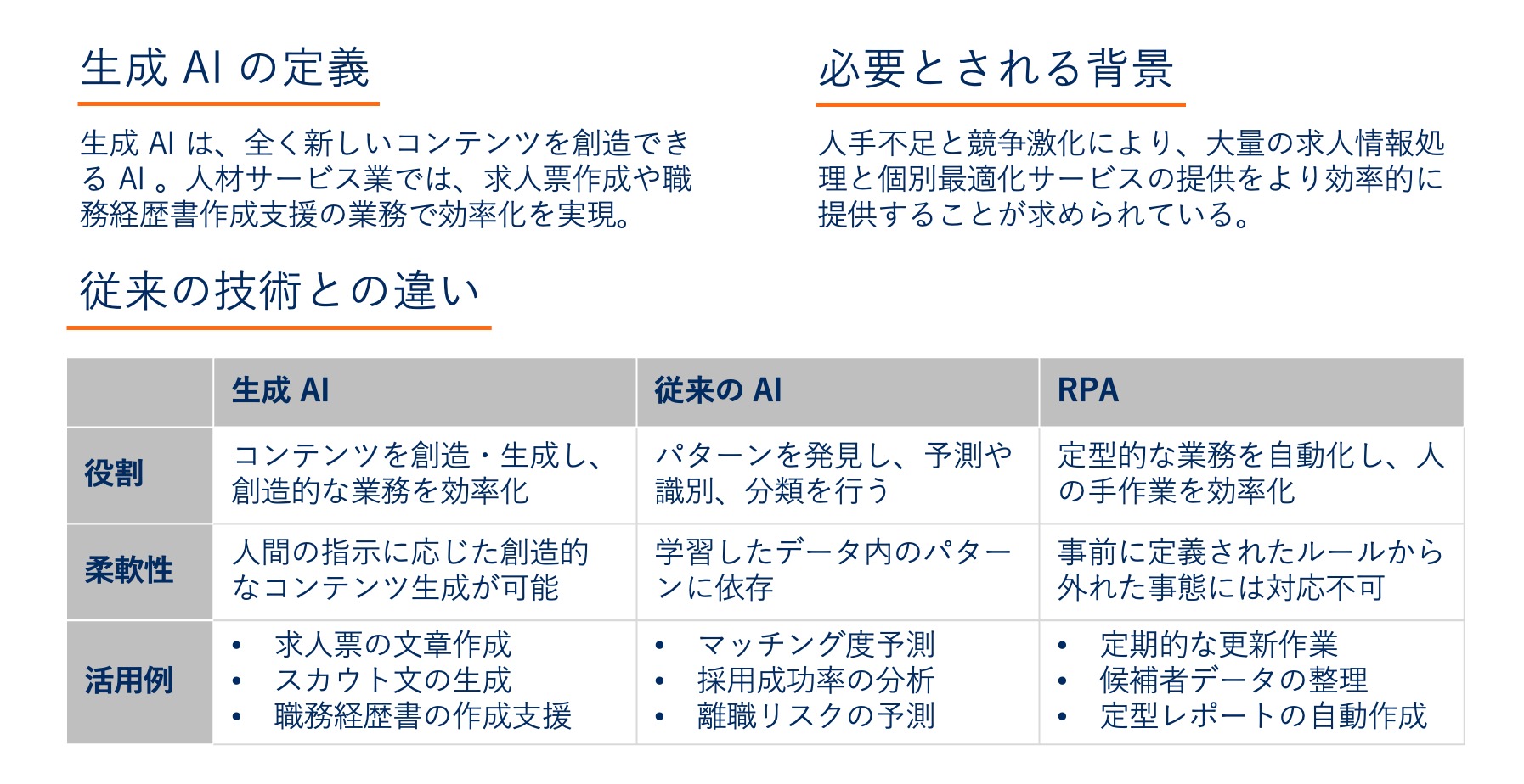 人材サービス業における生成 AI と従来の AI との最も大きな違いは、その役割にあります。