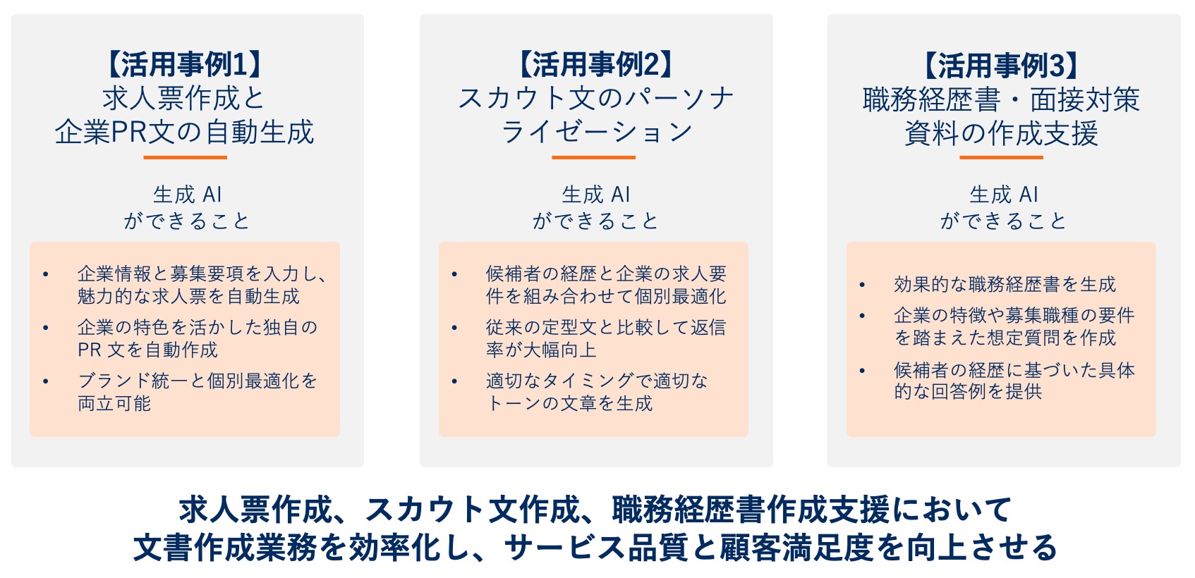 人材サービス業での生成 AI 活用は、すでに様々な業務領域でその効果を発揮し始めています。ここでは代表的な3つの活用事例をご紹介します。