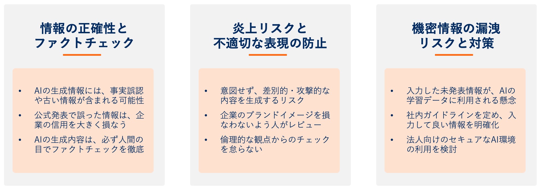 生成 AI は強力なツールですが、その導入と運用にはいくつかの注意点があります。