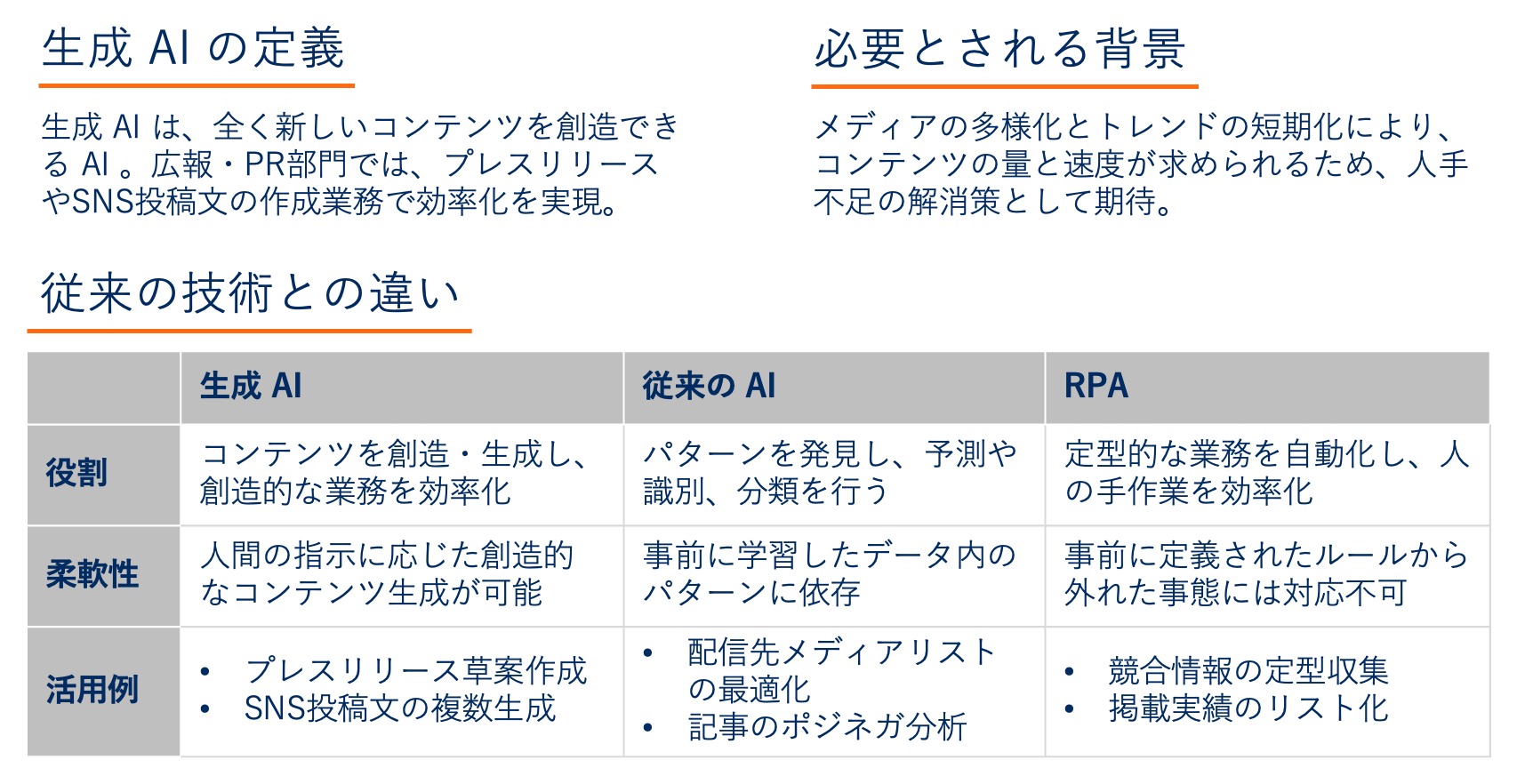 しかし、多くの企業では広報担当者のリソースは限られており、これらの要求に十分に応えることが困難です。生成 AI は、コンテンツ作成業務を自動化・支援することで、こうしたリソース不足の問題を解消し、広報活動の量と質を飛躍的に向上させる可能性を秘めています。