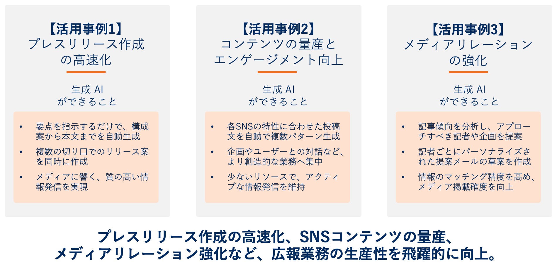 生成 AI は、すでに広報・PR の様々なシーンでその効果を発揮し始めています。ここでは代表的な3つの活用事例をご紹介します。