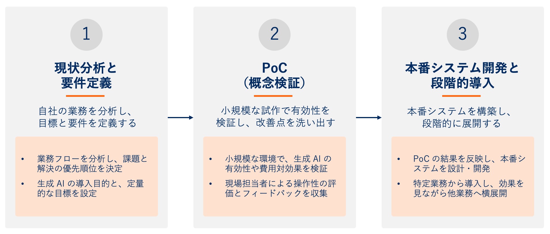 広報・PR 部門に生成 AI を導入する場合、どのような手順で進めればよいのでしょうか。ここでは、失敗リスクを最小化しながら効果的に導入を進めるための3つのステップをご紹介します。