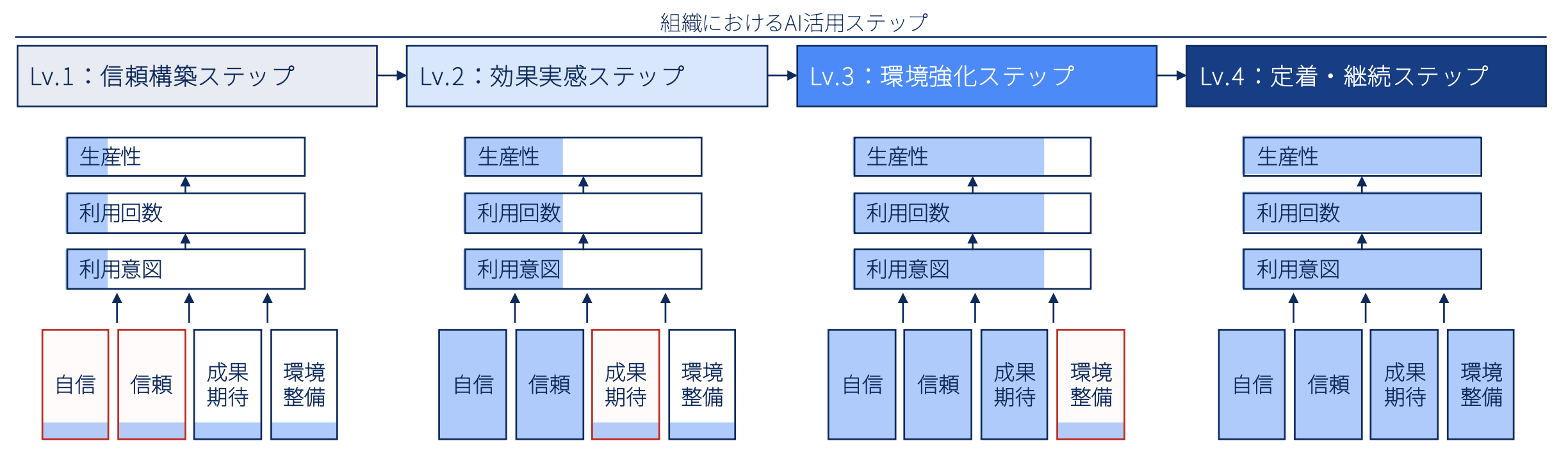 Lv4 | 信頼(Trust)・自己効力感(SE)・成果期待(PE)・促進条件(FC) | 環境整備も整い、組織全体で利用行動(UB)が最大化されている段階 |