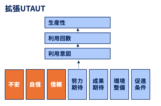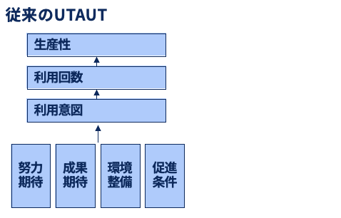 もともとのUTAUTは、業務成果への期待・努力期待・周囲の活用状況・環境整備という4つの因子で利用意図と利用行動を説明するモデルとして、企業のシステム導入や技術普及の分析に広く使われてきました。