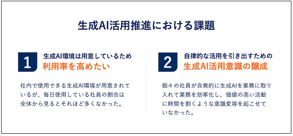 具体的には利用率の低さが挙げられます。社内で使用できる生成AI環境があるのですが、毎日使っている人は全体の2割程度もいないのではないかと思います。この割合は、私個人のきびしめの見解ではありますが、活用が十分に進んでいるとは言いがたい状況です。