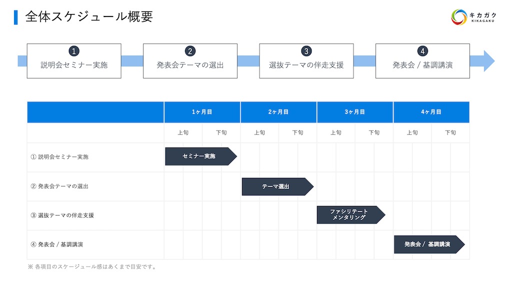 キカガクさんにご提案いただいた流れで、説明会からアイデアの募集、選抜、発表会に参加するチームへの伴走支援から発表会の開催、という流れで実施。募集の段階では150件以上のアイデアが集まり、発表会にはオンライン参加者含め約650名以上が参加しました。