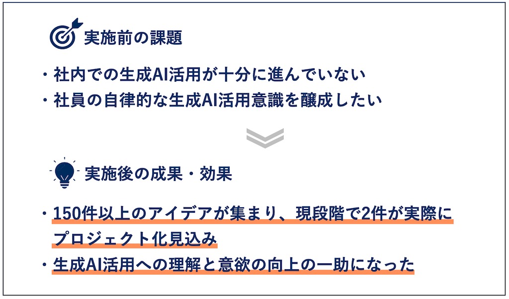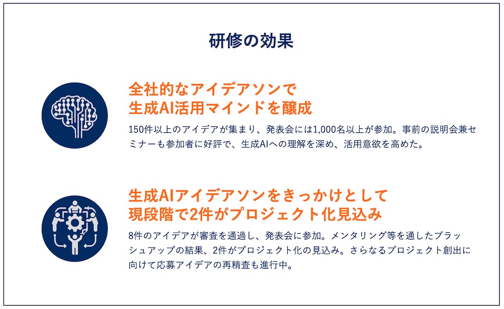 生成AI活用に向けた意識変容を起こしていくために様々な取り組みを行っていますが、生成AIアイデアソンもその一つとして位置づけています。社員の方々に自ら考えてアイデアを出してもらうことで、生成AIへの理解を深めて活用意欲を高めること、さらに生成AIを活用した業務効率化や新規事業の新たなプロジェクトが生まれることを狙いとしました。