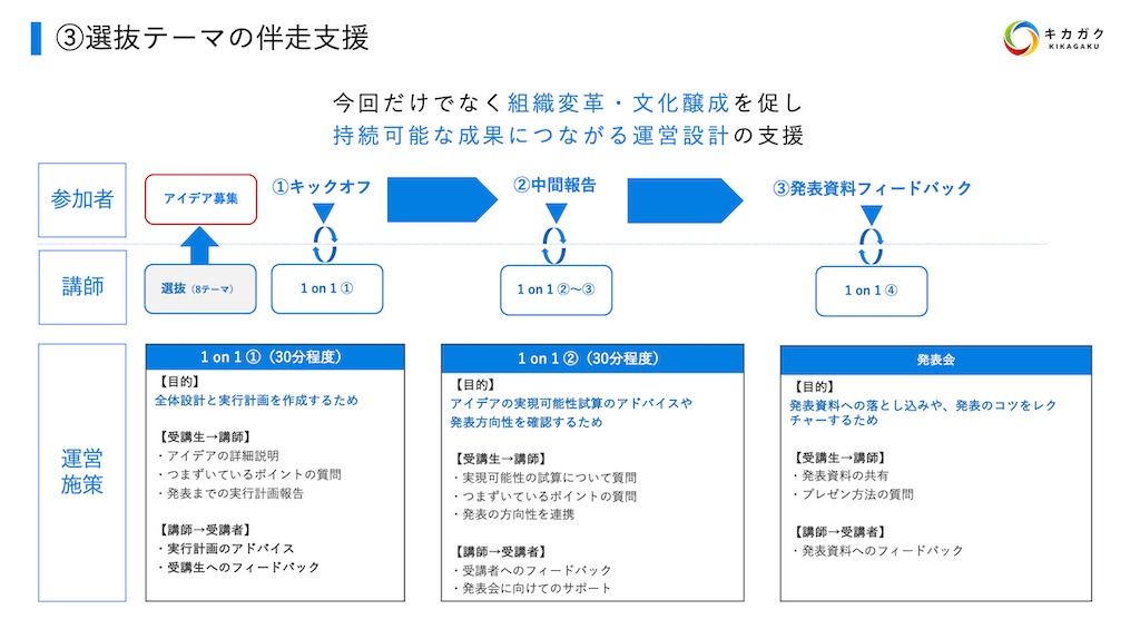 もう一つは、提案内容が我々の想定していたものと近かったことです。特に1on1や1onNでの各チームへのメンタリング、フィードバックの機会が多く設けられている点が魅力的でした。事前の説明会や募集したアイデアの審査、メンタリングの機会など、全体設計や支援内容がイメージ通りだったのでお任せしようと思えました。