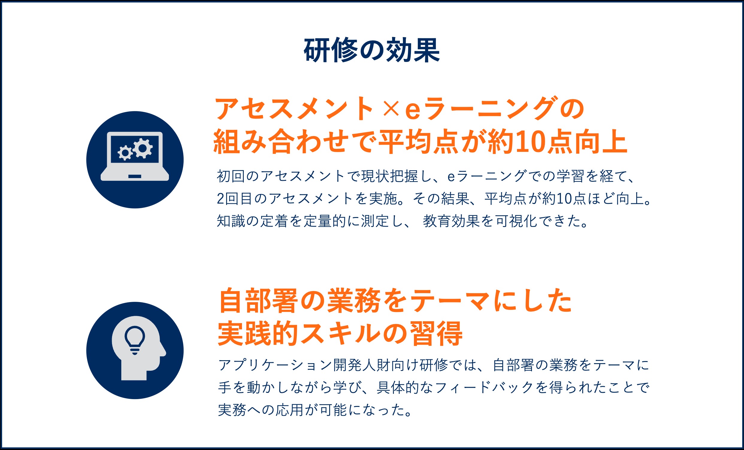 アセスメントとeラーニングの内容が合致しているため、eラーニングでの学習効果をアセスメントで計測することが可能であることも決め手の一つでした。