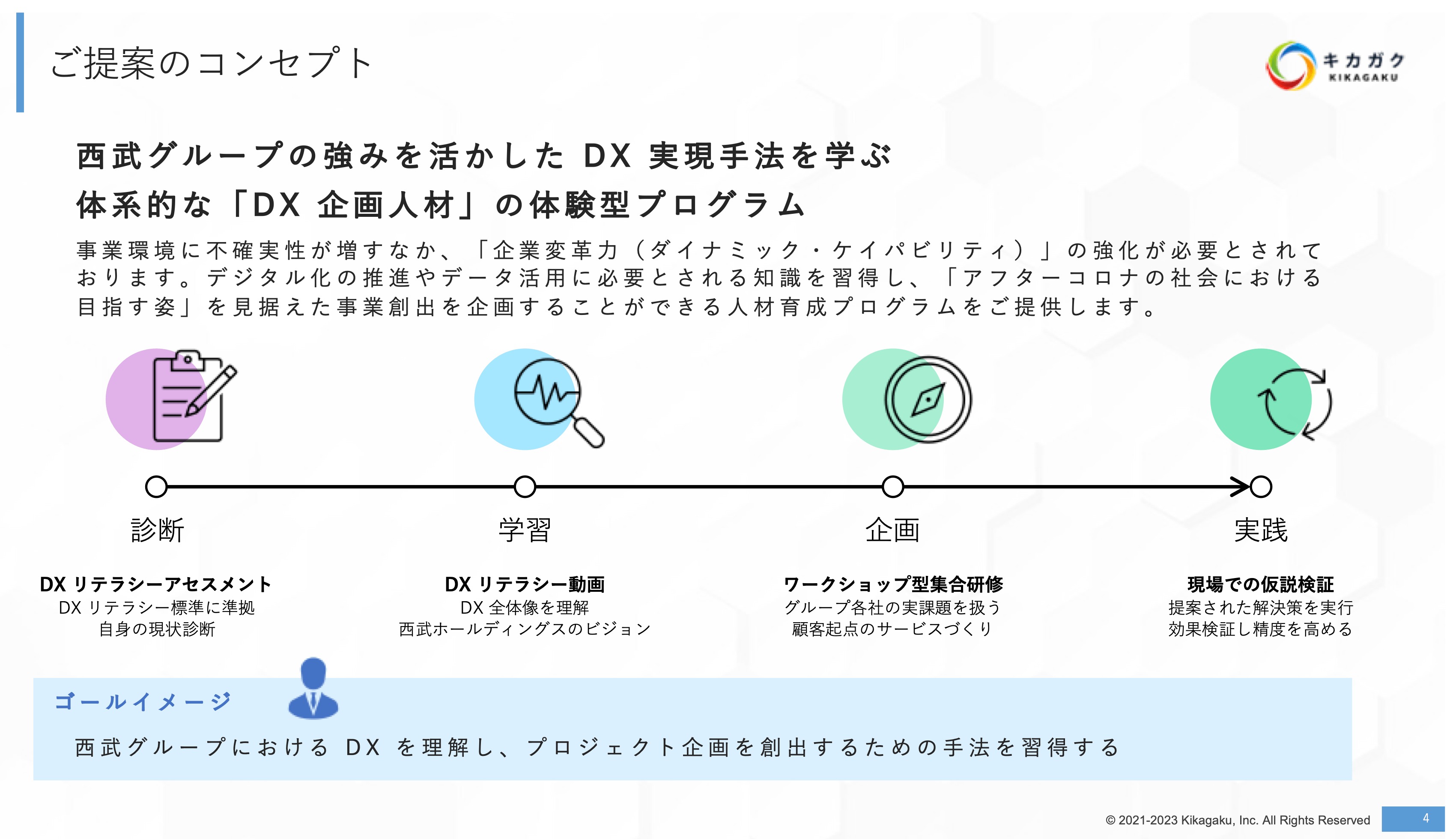 キカガクは、2023 年より株式会社西武ホールディングスへ「研修を研修で終わらせない」ために下記のようなアセスメントや研修を提供しております。