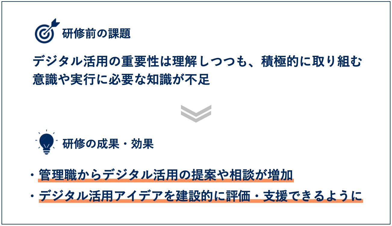 さらに、メンバーレベルのDX推進向け研修と共通する内容を実施できたことで、この内容が共通言語となり、部下からの提案を受け入れやすくなる素地を整えられたと考えています。以前は新しい提案は「前例がない」と却下されることも多かったのですが、研修後はリスクを認識した上でどのように進めるのがいいか、という考え方をしやすくなっているように感じます。