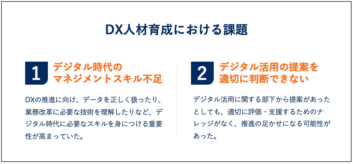 中村様:2025年までに、デジタルを活用した業務改革を推進でき、業務で扱うデータを正しく解釈できる管理職の育成を目指しています。特に、データに基づく判断の重要性が高まっている中で、管理職がその理解を深めることが不可欠だと考えています。