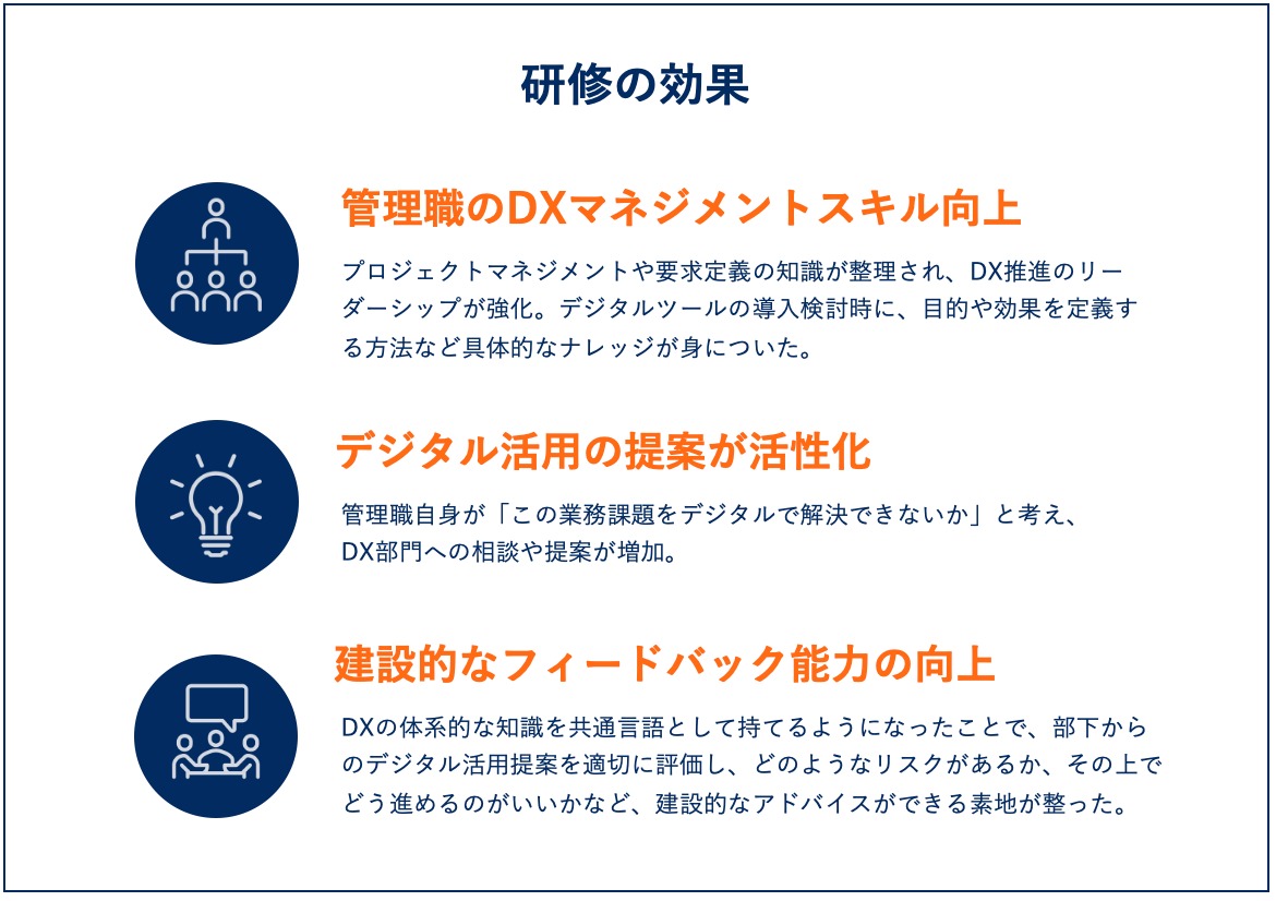 組織風土を醸成すること、変革に向けたプロジェクトの推進力を高めていくこと、これらを考えたときに、管理職への体系的な知識のインプットが鍵になるのではないかと思い至りました。プロジェクトマネジメントや要件定義といった知識を、トップコア人材だけでなく管理職層全体で共有することで、組織全体の変革推進力が高まっていくと考えています。