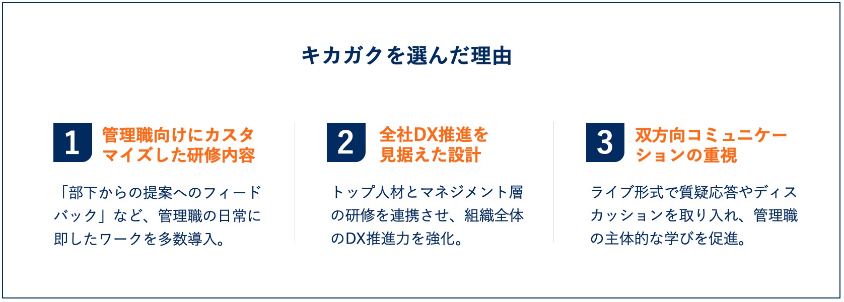 マネジメント層がリーダーとなってこの考え方を広げていくこと、さらにトップコア人材を含む推進人材と同じ前提知識を持てていることも重要だと考えました。
