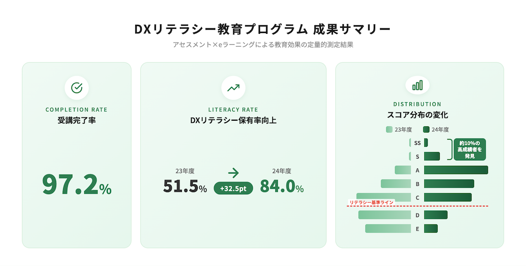 髙野様:動機付けと人事部門をメインとした受講促進の取り組みにより、2024年度の受講完了率は97.2%に達しました。アセスメント結果からわかるリテラシー保有率は2023年度には51.5%でしたが2024年度には84.0%と32.5pt向上しました。数値面での成果は想定以上です。
