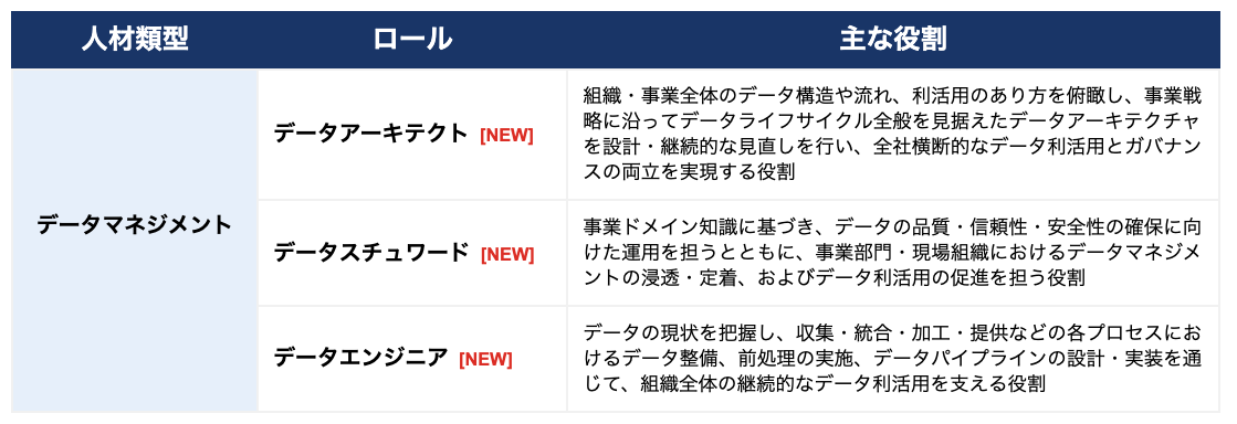 「データエンジニア」ロールを新設の「データマネジメント類型」へ移管し、「データビジネスストラテジスト」「データサイエンスプロフェッショナル」の2ロール体制に集約。解析とAIの実装・運用に特化し、最新AIの実装運用とAIガバナンス構築が新たな役割として追加されました。