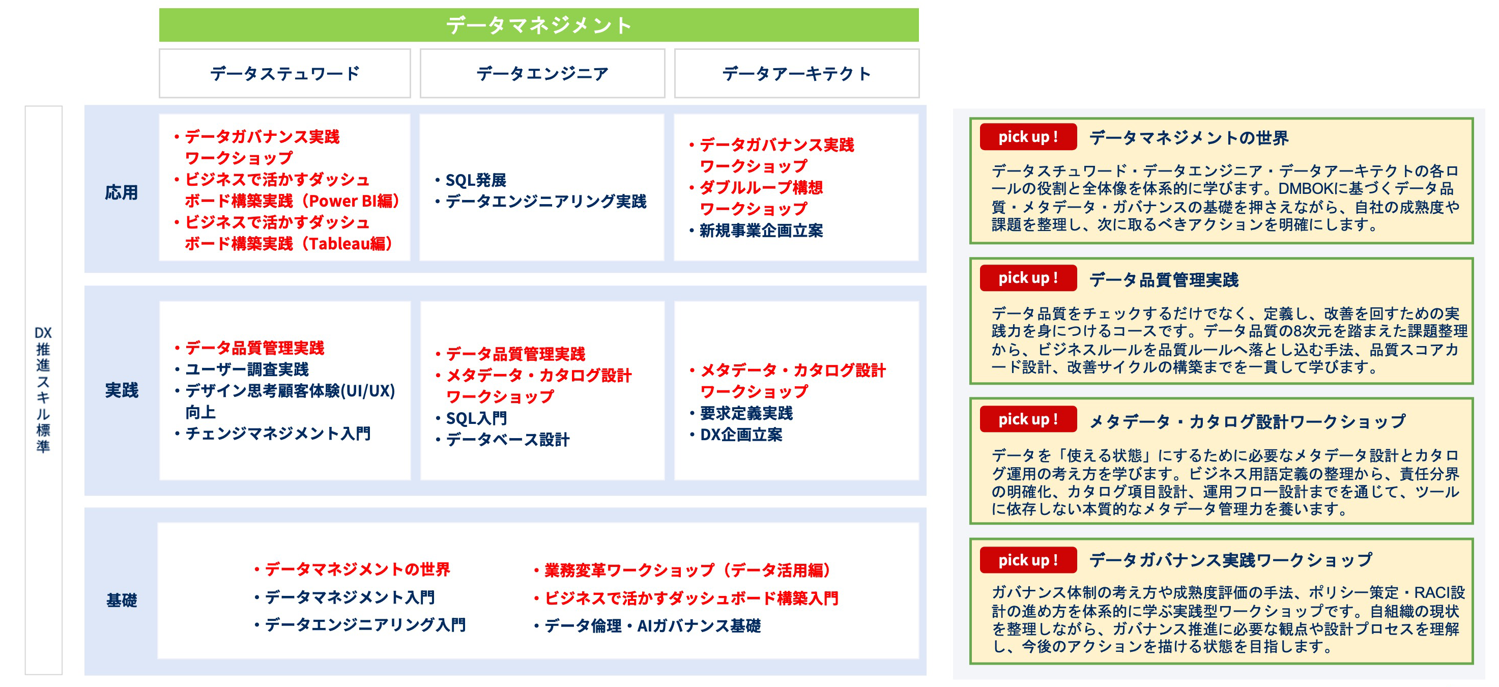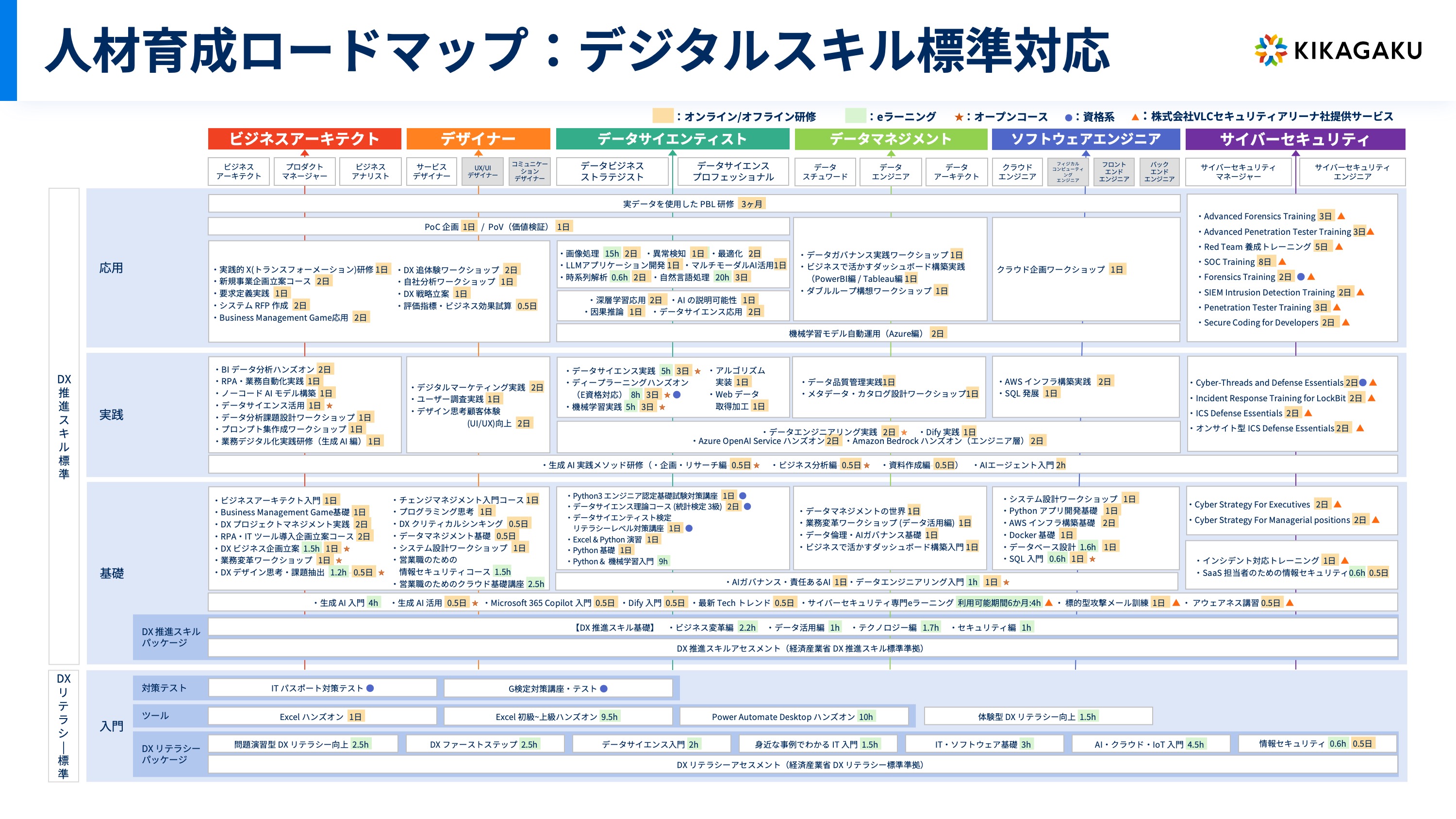 今回の改訂で、新たに「データマネジメント類型」が新設されましたが、キカガクが提供するDX人材育成カリキュラムにおいても上記に完全対応し、データアーキテクト/データスチュワード/データエンジニアの3ロールに合わせ、「データマネジメントの世界」「メタデータ・カタログ設計ワークショップ」「データ品質管理実践」「データガバナンス実践ワークショップ」など新規12講座を整備しました。
