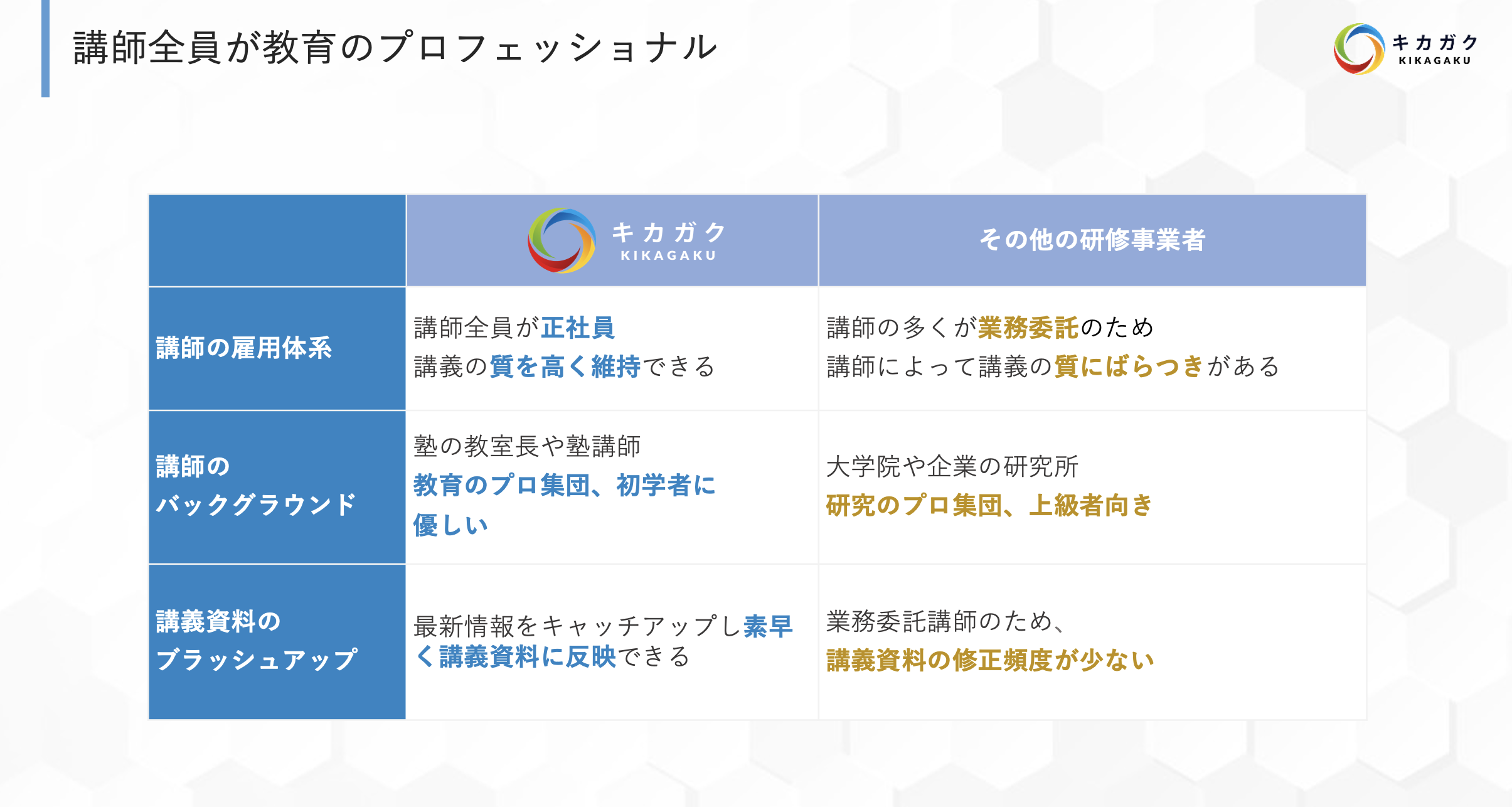 業務の 60%は知識のインプットの時間に当てれるため、最新の情報をキャッチアップし、素早く講義資料に反映しています。