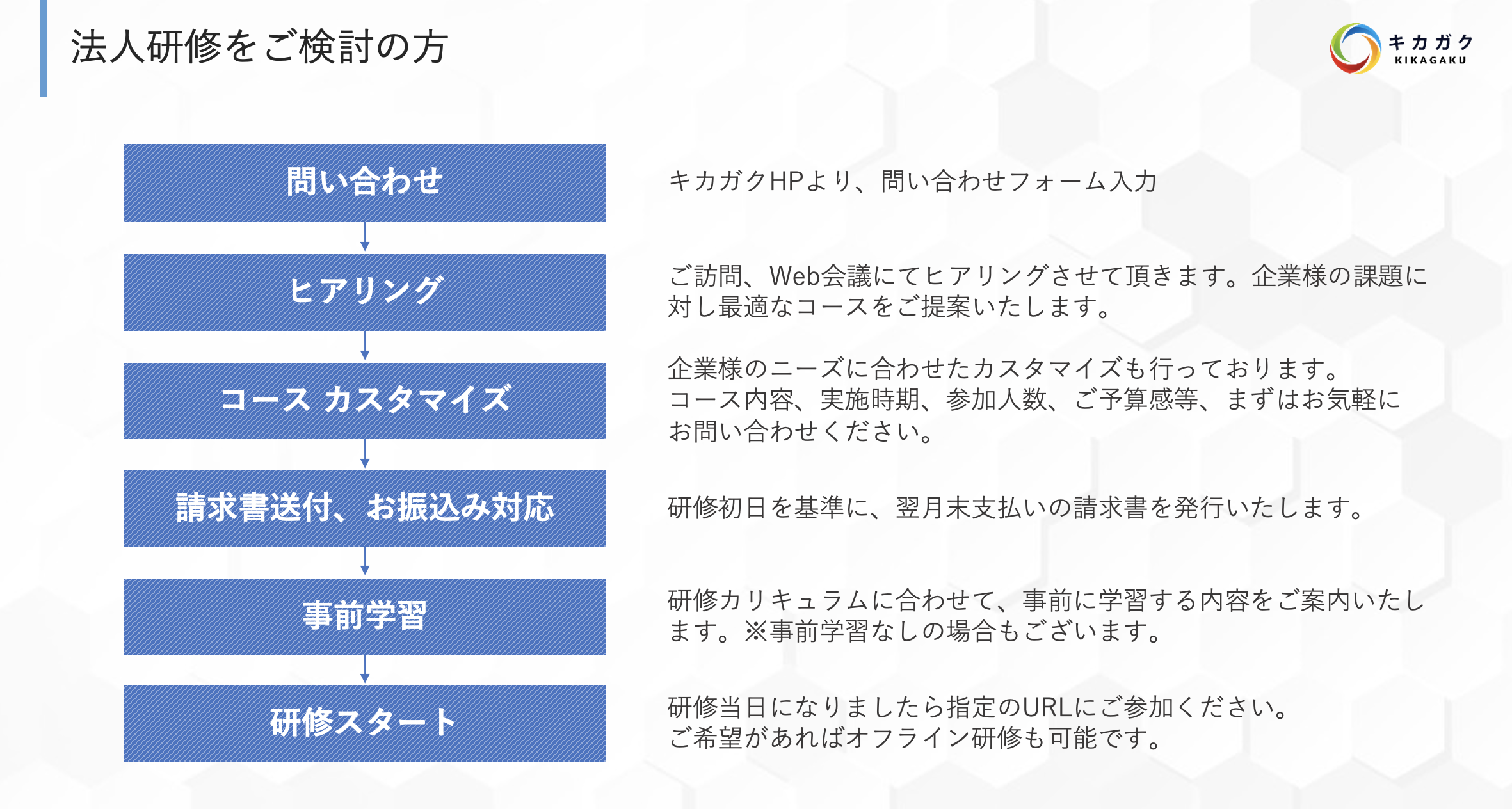 研修が終了した後も自走できる力を身につけていただくことも一つの目的としています。